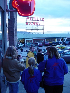 | Kelviden Jackets take on the Seattle Market . | Katy and I ride the Monorail. | The view from our hotel |